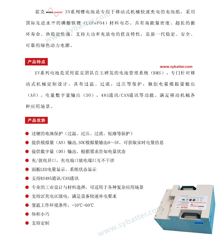 霍克 HAWKER EV系列動(dòng)力電池,是先進(jìn)水平的磷酸鐵鋰(LiFePO4)動(dòng)力電池系統(tǒng)。具有能量密度高、循環(huán)壽命長(zhǎng)、充放電性能優(yōu)良、溫度性能好,是新一代高安全性、高可靠性的綠色電源。
