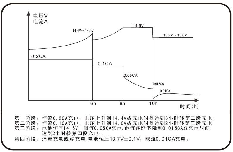 電池類型:AGM、膠體、半膠體、富水注水電池(出廠時已設定充電程序,如需再次選擇,需在專業人員指導下進行